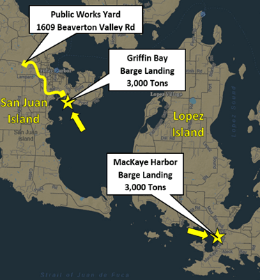 Walrath Marine, a Tacoma-based company specializing in material trucking and tug and barge services, will deliver 3,000 tons of road sand and 3,000 tons of road maintenance aggregate to the islands. On San Juan Island, the barge will land at Griffin Bay and material will be hauled to the Public Works yard located on Beaverton Valley Road. On Lopez Island, the barge will land at MacKaye Harbor (Norman Rd) and material will be stockpiled onsite. This material is critical to the Public Works Department’s ability to respond to winter weather and chip seal county roads. Bulk delivery is the most effective way to transport material to the county and greatly reduces the number of vehicle trips on our roads and ferries. See map below for more information.